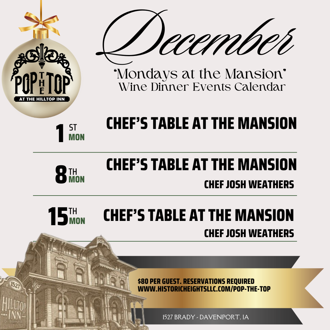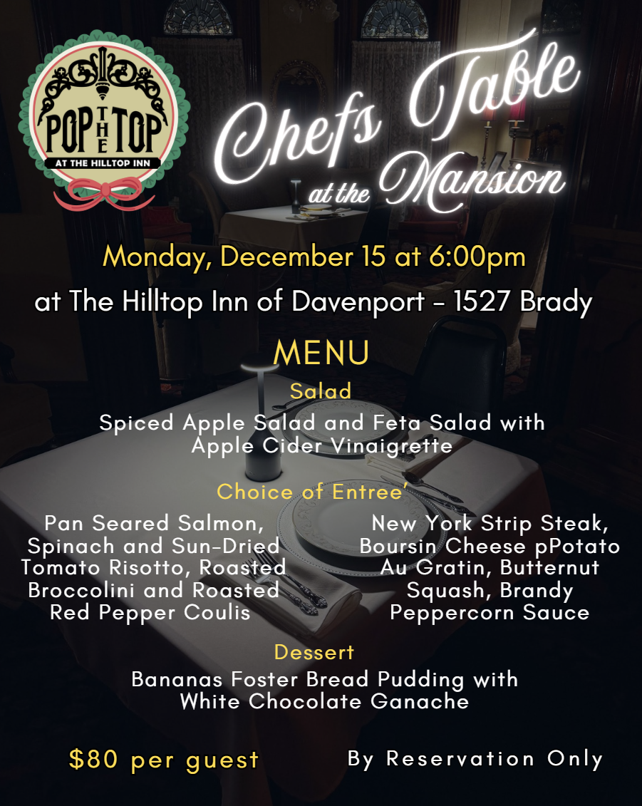 “Pop the Top” is a new and unique set of special events hosted at The Hilltop Inn. A variety of “pop-up” fine dining experiences along with some mixology classes and fun-filled craft nights will continually be offered on select week nights for you and your friends to enjoy. This historic mansion offers a one-of-a-kind experience like no other in the Quad Cities.